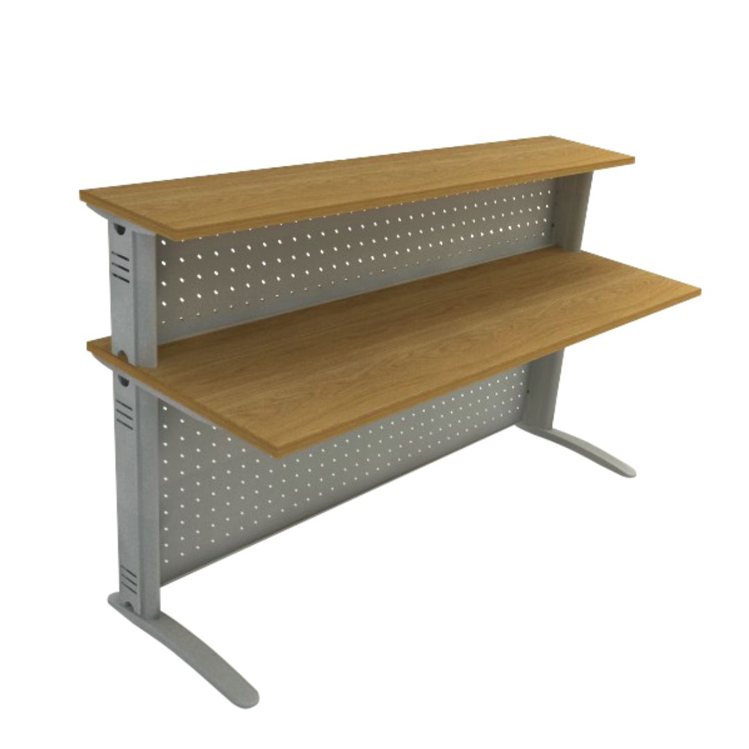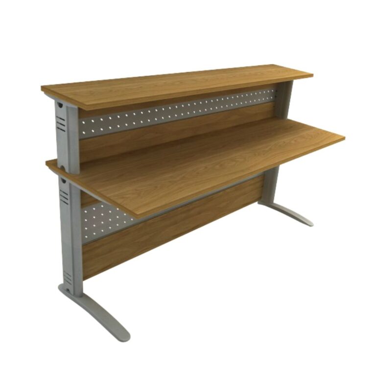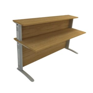 O mesanino proporciona uma área adicional para armazenamento ou exposição de materiais, tornando o atendimento mais eficiente e organizado. As saias estão disponíveis em três opções: madeira, mesclada e aço perfurado, permitindo personalização conforme a identidade visual da sua empresa.