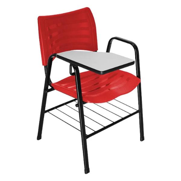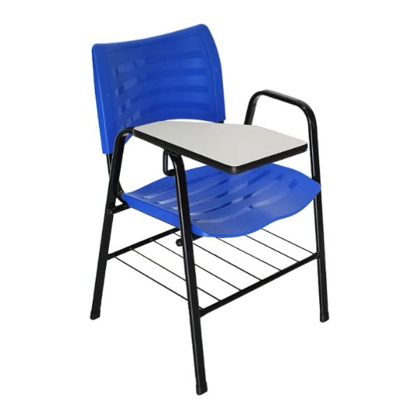 A cadeira universitária apresenta uma estrutura inteligente, composta por um tubo oblongo que incorpora recursos essenciais para o ambiente acadêmico. Contudo, equipada com prancheta escamoteável, braços e porta-livros, a cadeira proporciona uma solução completa, ideal para estudantes que necessitam de espaço para escrever e armazenar materiais durante aulas e estudos.