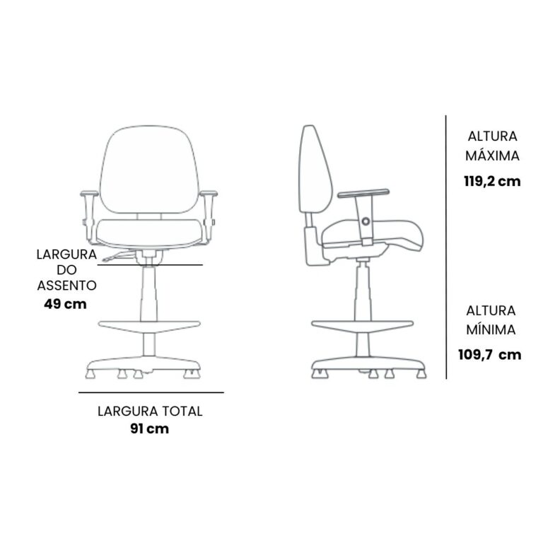 A faixa de altura ajustável, variando de 1097 mm a 1192 mm, garante que a cadeira se adapte a diferentes usuários e contextos de trabalho. As dimensões do assento (490 mm de largura) e do encosto (480 mm de largura) foram projetadas para oferecer um suporte eficaz e um conforto duradouro.