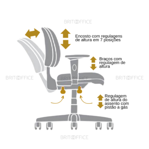Seu encosto anatômico possui 490 mm de altura e 460 mm de largura, proporcionando um apoio confortável para a coluna, alinhado às exigências ergonômicas. O assento espaçoso, com 460 mm de largura e 430 mm de profundidade, permite liberdade de movimento e postura correta.