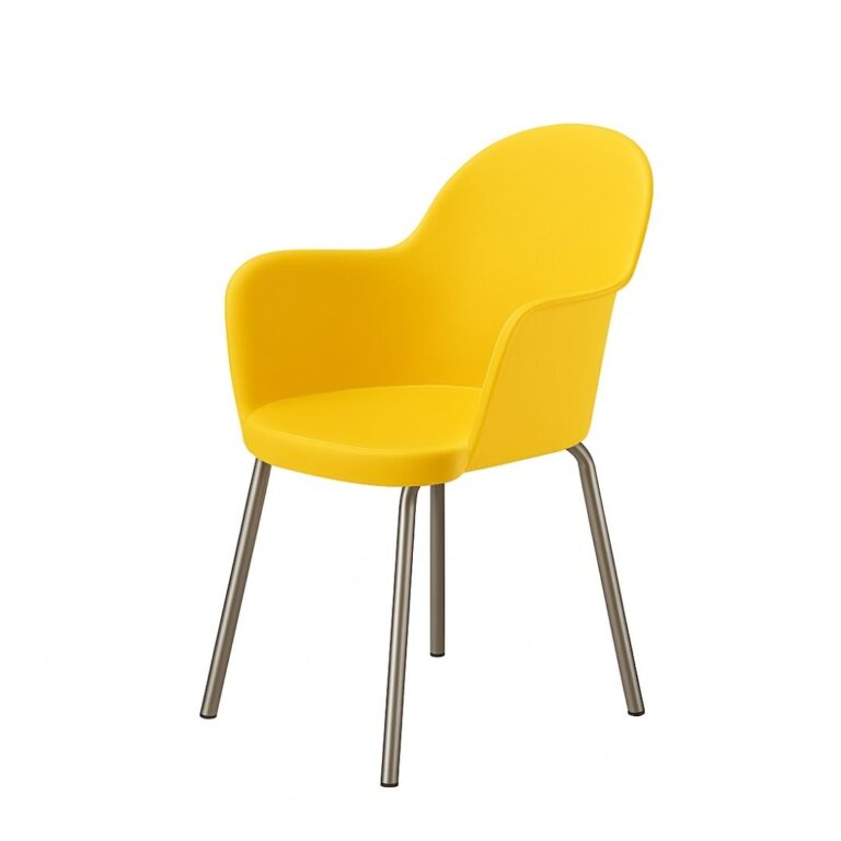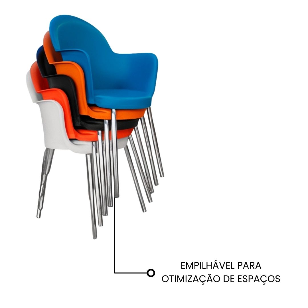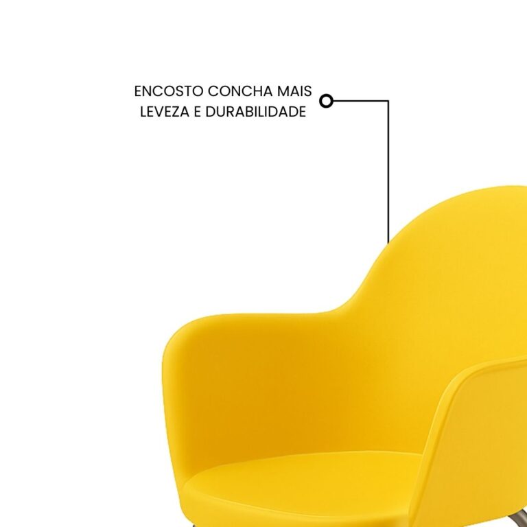 A concha da cadeira é fabricada em polipropileno de alta resistência, disponível nas cores branco, preto, azul, vermelho e verde, permitindo integração a diferentes propostas de decoração corporativa. A estrutura fixa conta com opções de acabamento em pintura preta, cinza ou cromada, agregando sofisticação e adaptabilidade a variados projetos de interiores.