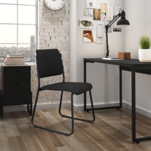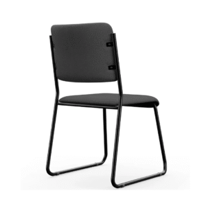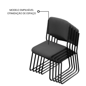 Seu design empilhável facilita a organização de ambientes dinâmicos como salas de reunião, auditórios e áreas de espera. O assento e encosto possuem espuma flexível de densidade D-18, revestidos em materiais como Crepe, Vinil, Couríssimo e outros acabamentos de alta qualidade – disponíveis em uma ampla paleta de cores e texturas.
