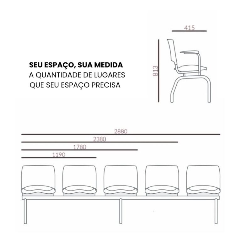Outro diferencial está na flexibilidade de configuração: disponível em versões de 2, 3, 4 ou 5 lugares, com opção de apoio de braço fixo ou sem braço, a linha possibilita a personalização conforme a necessidade do espaço.