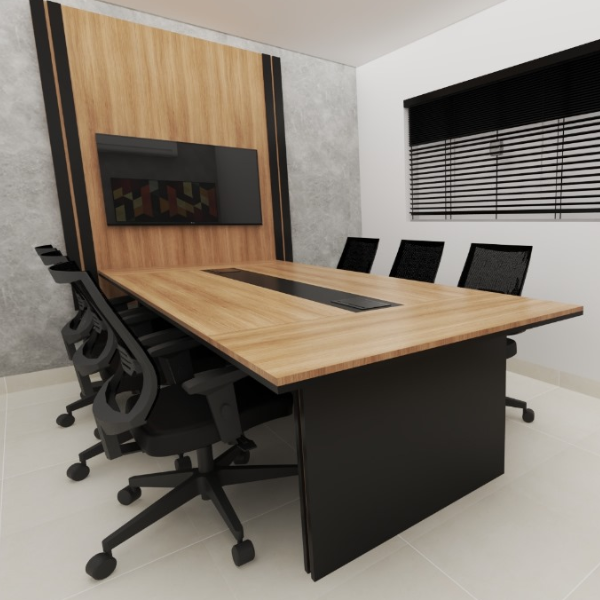 Além da estética, a mesa possui recursos modernos para atender demandas empresariais. Tomadas elétricas embutidas mantêm dispositivos prontos para uso, eliminando cabos. Sua estrutura robusta permite reuniões ininterruptas.