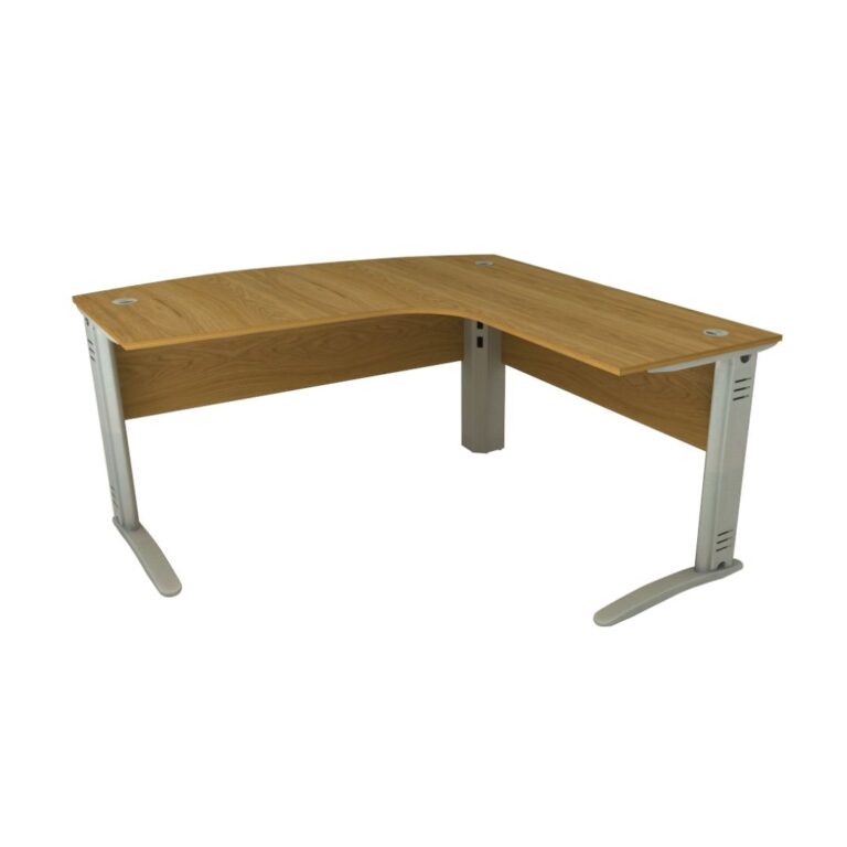 Os pés da mesa são fabricados em chapa de aço carbono, tanto na versão de canto quanto na lateral, conferindo estabilidade e resistência ao uso diário. Essa escolha de material garante que a mesa suporte a carga e o desgaste típicos de ambientes de trabalho.