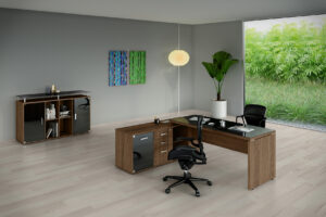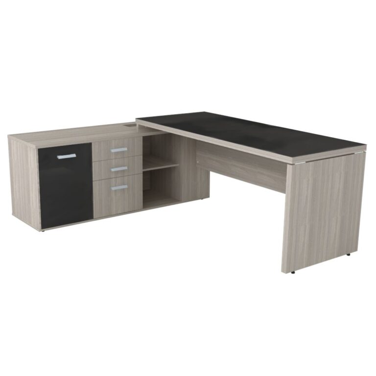 A Mesa Diretiva com Armário é uma peça sofisticada e funcional, ideal para ambientes executivos. Com seu design em L, ela oferece amplo espaço para trabalho e organização, além de um toque moderno com acabamento em vidro.
