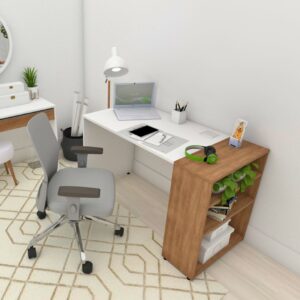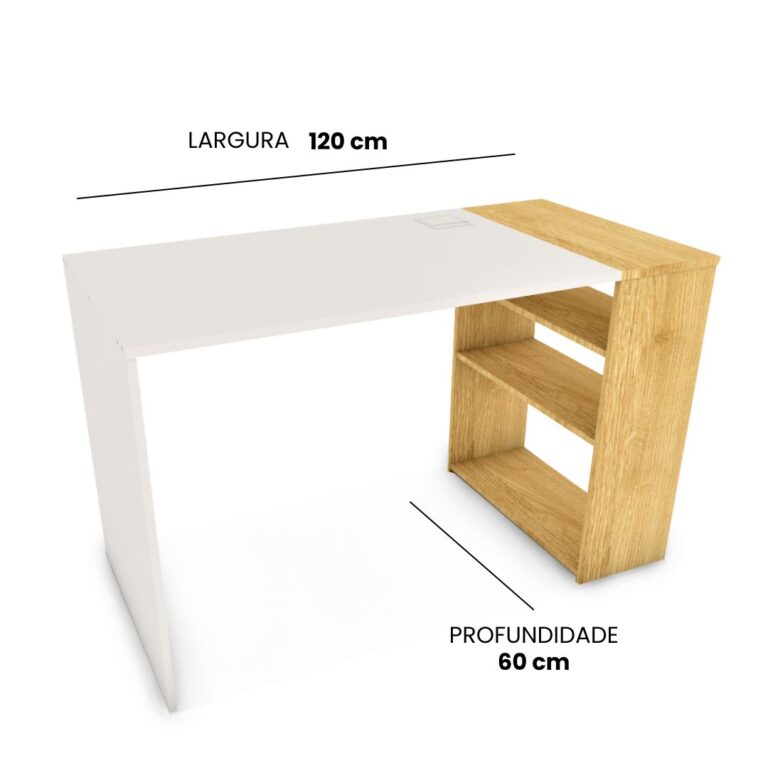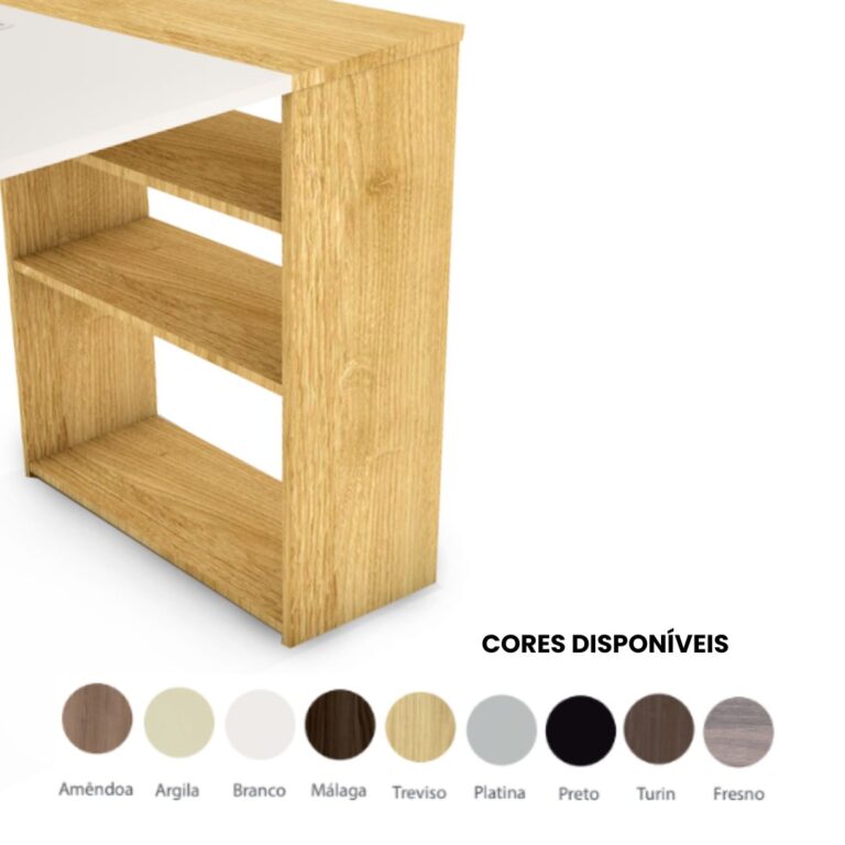 Um dos grandes diferenciais dessa mesa é sua estrutura vazada em uma das laterais, que integra 2 prateleiras funcionais. Essa solução inteligente otimiza o espaço de trabalho, permitindo armazenar documentos, pastas, livros e itens de apoio sempre ao alcance, sem comprometer a organização do ambiente.