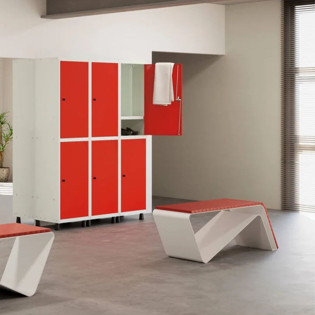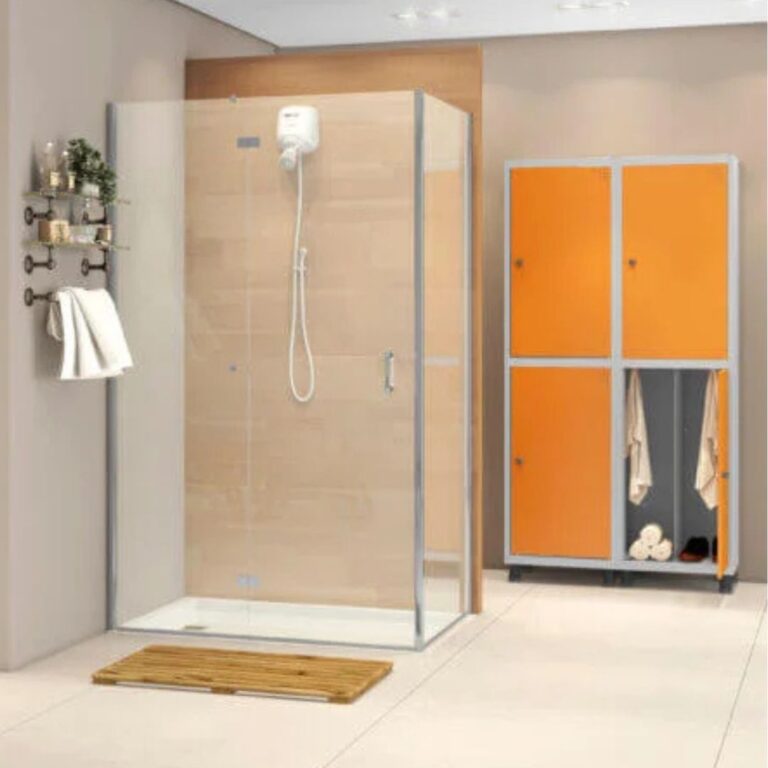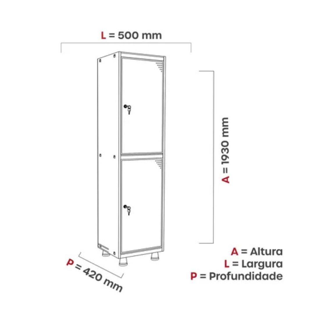 Sua estrutura é fabricada em chapa de aço #26, com prateleira base reforçada em chapa #24, garantindo estabilidade mesmo em uso constante. O fechamento pode ser feito por pitão para cadeado ou fechadura com chave, oferecendo flexibilidade e proteção aos objetos armazenados.