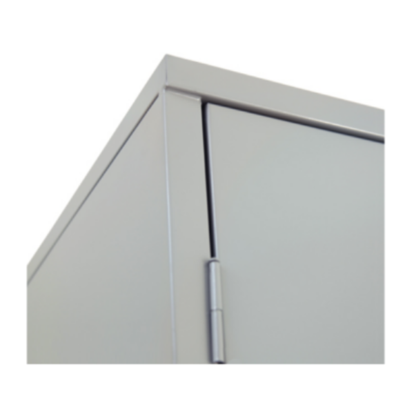 A estabilidade do roupeiro é mantida por quatro pés feitos em chapa #18 dobrada, que são destacados do conjunto do piso. Ademais, esses pés oferecem um suporte sólido e nivelado, independentemente do tipo de superfície em que o roupeiro seja colocado, garantindo sua estabilidade.