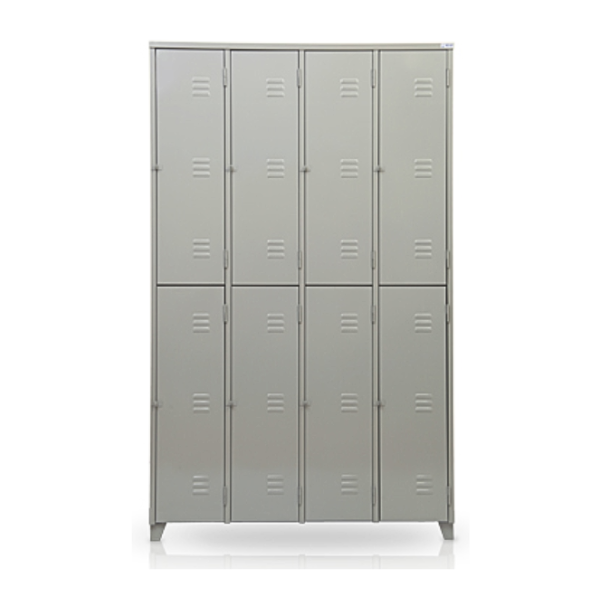 Com 8 vãos sobrepostos, esse roupeiro oferece um espaço intermediário para organizar pertences pessoais, uniformes ou objetos, tornando-o ideal para locais com necessidades de armazenamento moderadas. Cada porta é reforçada internamente com um suporte vertical, proporcionando maior resistência e longevidade ao móvel, o que é essencial para suportar o uso frequente.