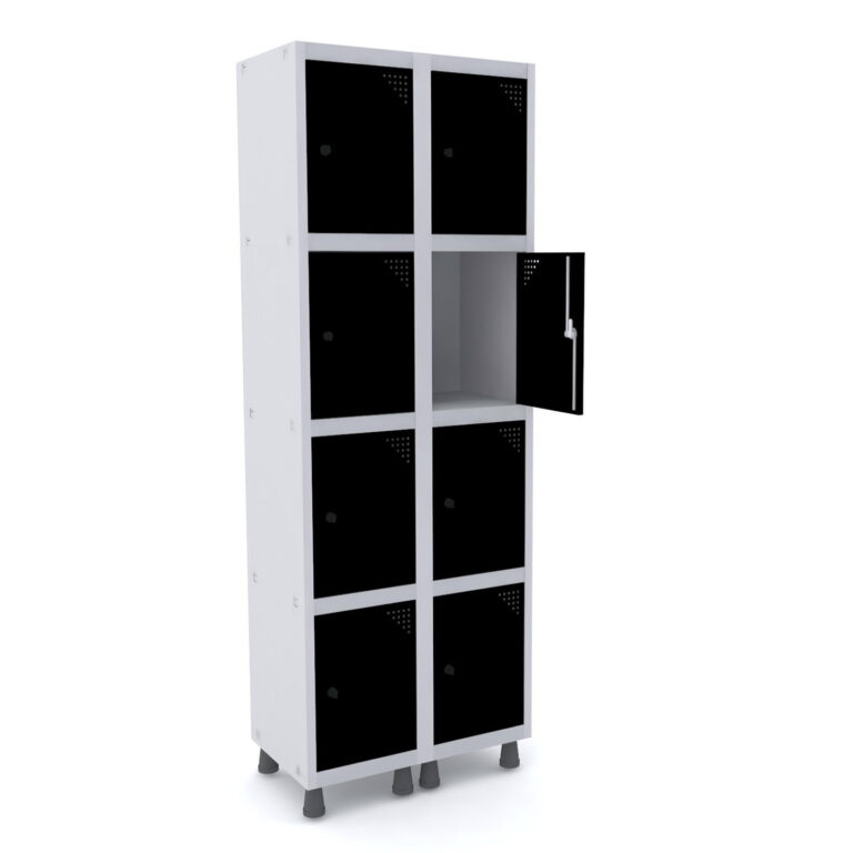 A estrutura do roupeiro é notável, com o corpo, laterais e portas confeccionados em chapa de aço #26, tornando-o resistente e capaz de suportar o uso constante. Isso o torna adequado para espaços com alto tráfego, como escritórios, escolas e vestiários, onde a segurança e a durabilidade são essenciais.